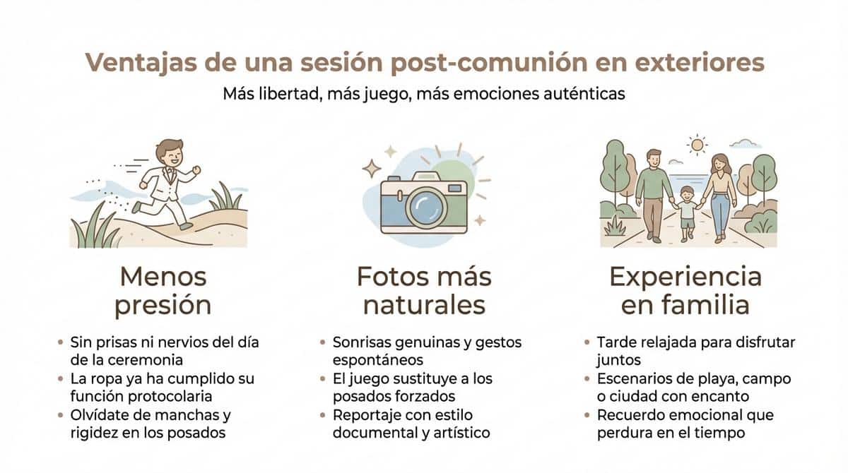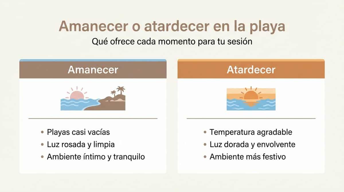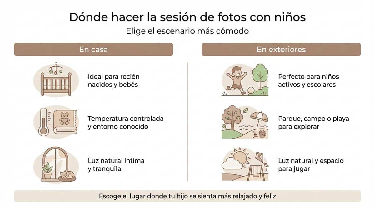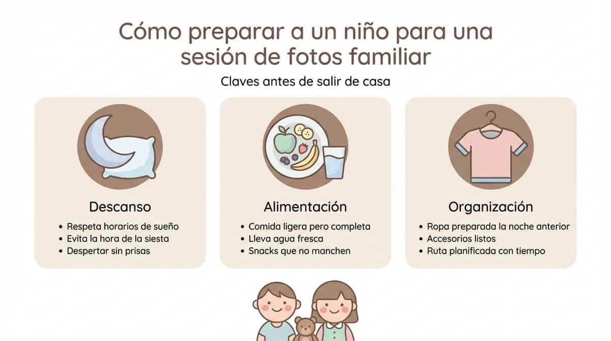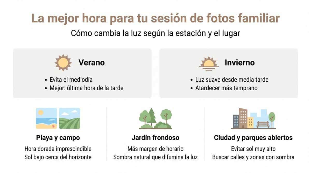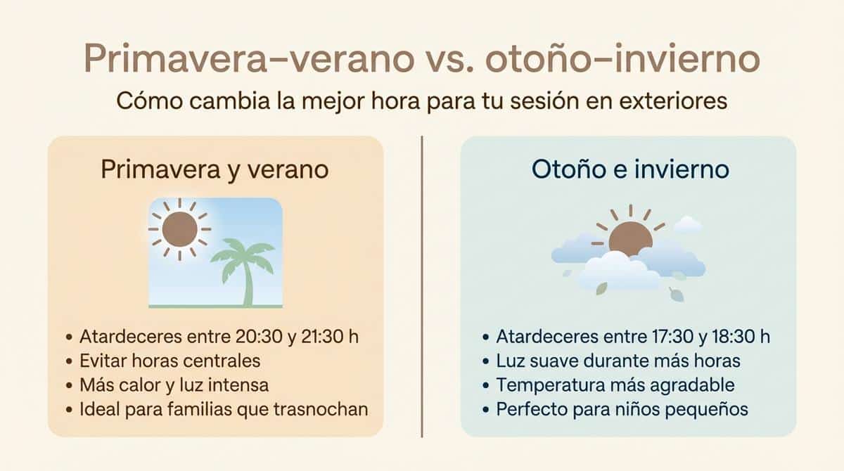 Elegir el momento adecuado del día es determinante para mantener la energía y el buen humor durante el reportaje. Por lo general, las primeras horas de la mañana suelen ser ideales, ya que tanto las personas mayores como los niños están más descansados y frescos. Si la mañana no es posible, el momento justo después de la siesta también ofrece una ventana de tranquilidad antes de que caiga la tarde y llegue el cansancio acumulado del día.