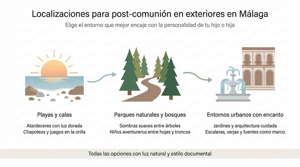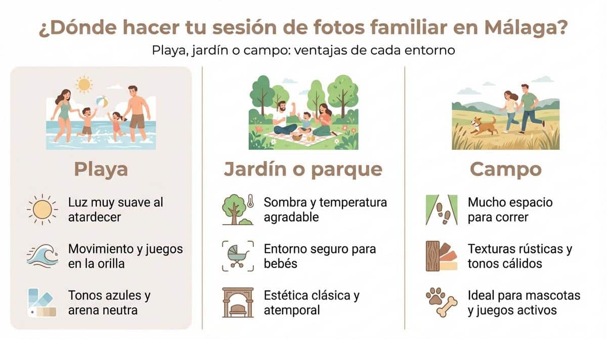 El entorno juega un papel crucial en la comodidad de los abuelos, condicionando su movilidad y su disposición a participar. Para un reportaje de fotos de familias en Málaga, los exteriores como paseos marítimos planos o parques con senderos firmes son opciones excelentes, siempre que garanticen un desplazamiento seguro. Debemos evitar terrenos irregulares, pendientes pronunciadas o arena suelta de playa si la movilidad es reducida, ya que esto podría generar inseguridad o riesgo de caídas.