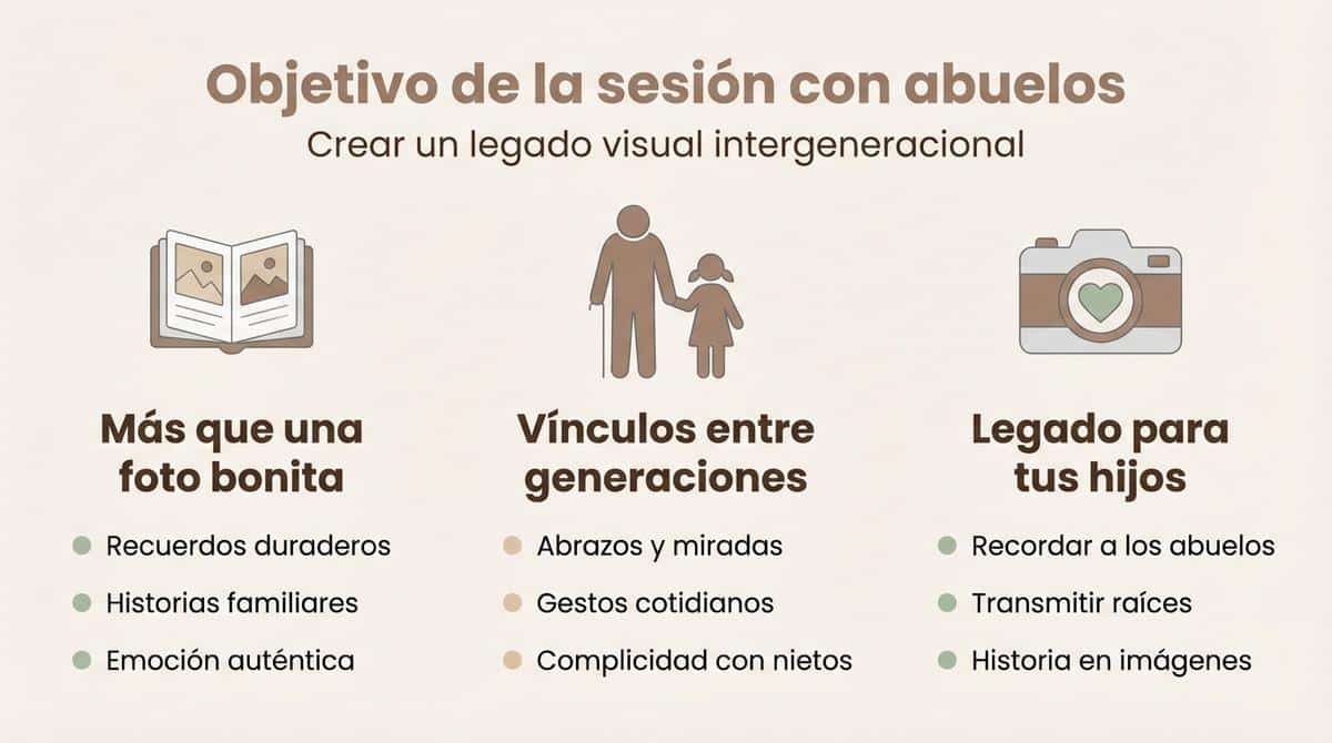 Reunir a diferentes generaciones frente a la cámara tiene un propósito que trasciende la simple obtención de una imagen bonita para enmarcar. Se trata de construir un testimonio tangible de los lazos afectivos que unen a la familia, preservando gestos y miradas que con el tiempo adquieren un valor incalculable. Al plantear esta experiencia, buscamos generar un legado visual duradero que tus hijos podrán revisar en el futuro para recordar cómo era el tacto, la risa y la presencia de sus abuelos.