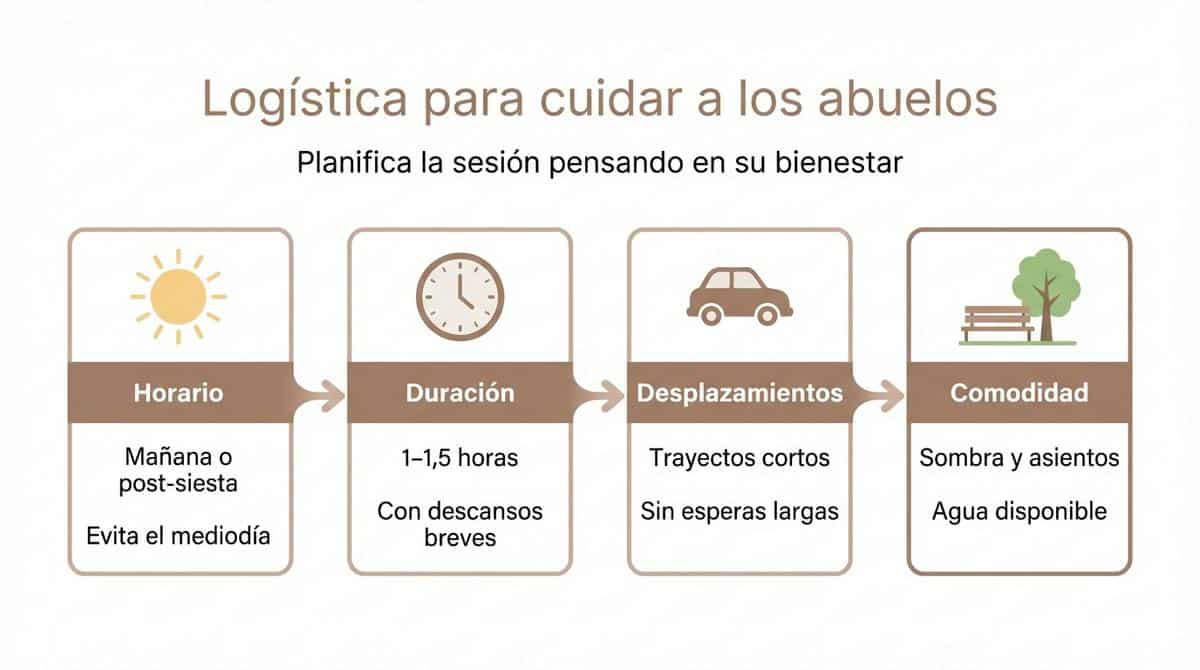 Si la sesión se realiza en exteriores, es vital localizar zonas con sombra, especialmente en los meses cálidos, y asegurarse de que existen bancos o muretes cercanos donde poder sentarse. La accesibilidad no es un capricho, sino un requisito para que la experiencia sea inclusiva. Un entorno amable permite que los mayores se concentren en disfrutar de sus nietos en lugar de preocuparse por dónde pisan.