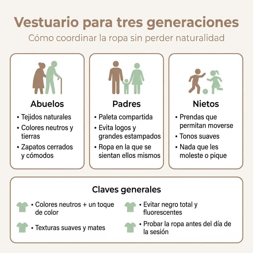 Lograr una armonía visual entre tres generaciones sin caer en la uniformidad requiere un poco de estrategia y comunicación previa. Lo ideal es seleccionar una paleta de colores común, preferiblemente tonos neutros, tierras o pasteles suaves, y dejar que cada miembro de la familia elija prendas dentro de esa gama que le hagan sentir bien. Esta coordinación sutil elimina distracciones visuales y pone el foco en las caras y las expresiones, reforzando la sensación de unidad familiar.
