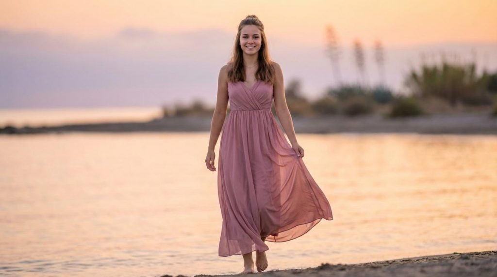 Las sesiones junto al mar piden a gritos una estética más orgánica y fluida. Aquí, la rigidez sobra; lo ideal es optar por vestidos ligeros que permitan, si la situación lo requiere, mojarse un poco el bajo sin que sea un drama. La imagen de una chica caminando por la orilla con el vestido en la mano transmite una sensación de libertad única propia de esta etapa vital.