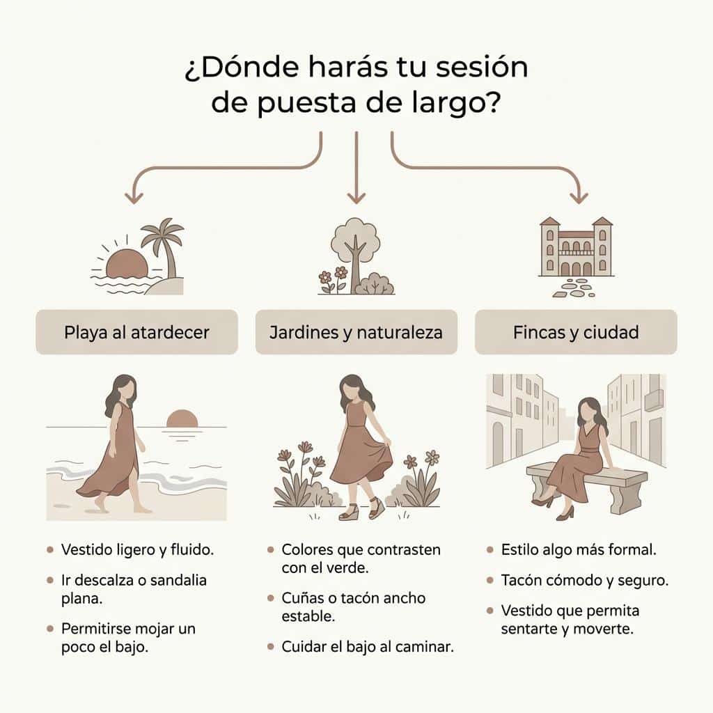 Nuestra provincia ofrece escenarios muy diversos que condicionan totalmente el estilo del reportaje. No es lo mismo posar entre las rocas de una cala al atardecer que caminar por los jardines de una finca histórica. El entorno no solo define el fondo de la imagen, sino que exige una coherencia estética y práctica en el vestuario.