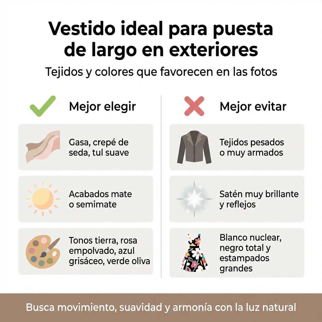 Por el contrario, las telas muy pesadas, los brocados rígidos o los rasos con mucho brillo pueden jugar en contra. El satén brillante, por ejemplo, tiende a generar reflejos indeseados bajo el sol directo y marca cada pequeña arruga de forma muy visible. Optar por acabados mate o semimate garantiza una piel más luminosa y una imagen general más limpia y sofisticada.